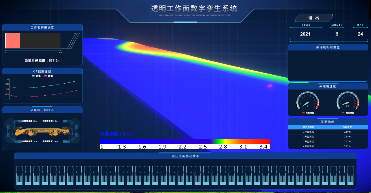 Sistem Twin Digital Twin Lingkungan Cerdas yang transparan membangun adegan penambangan virtual tiga dimensi, mendaftarkan model geologis dan peralatan, memetakan kondisi penambangan nyata ke dunia maya, dan mewujudkan manajemen digital dan kontrol wajah kerja.